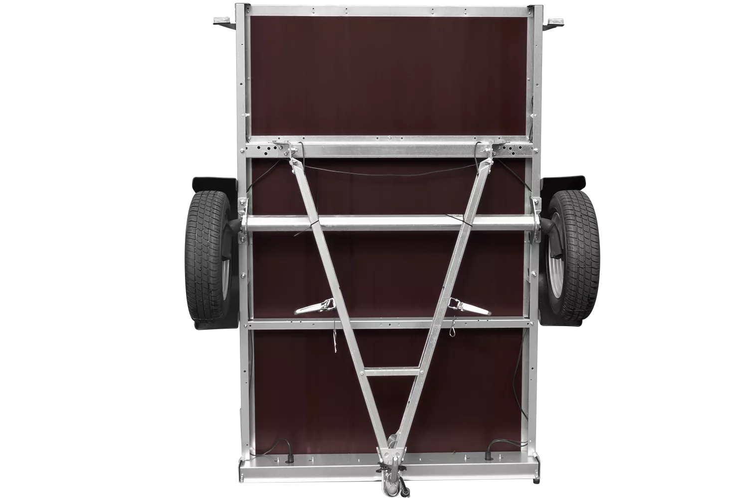 - Kippbare V-Deichsel, die jederzeit unter der Bodenplatte des Anhängers eingeklappt werden kann